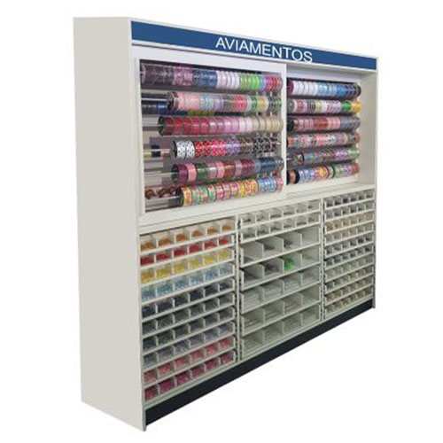 27 gavetas subdivididas para botões e miudezas em geral, 24 suportes para fitas e 8 prateleiras para fitas