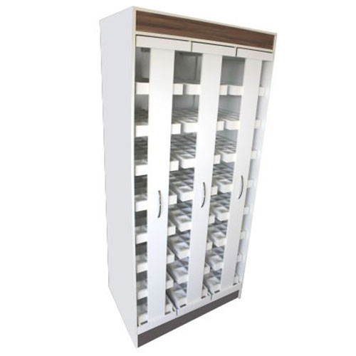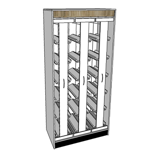 18 prateleiras inclinadas para fitas e 18 suportes para fitas