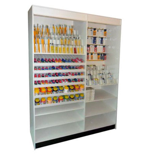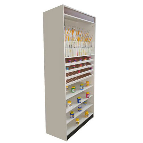 6 prateleiras inclinadas com divisões para tintas, 3 prateleiras, 39 nichos para pincéis e canaletadoDimensões: 1,405m x 0,40m x 2,00m (CxLxA)